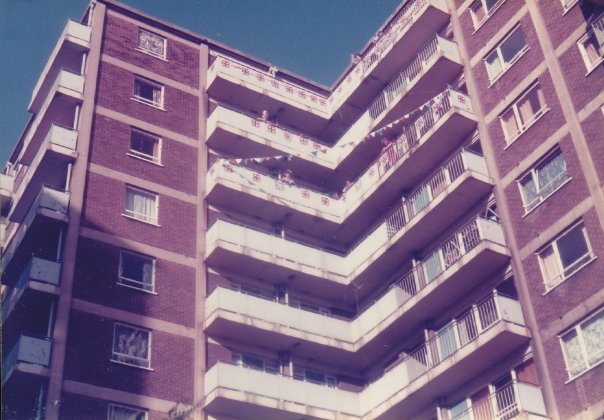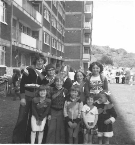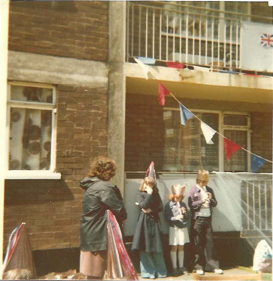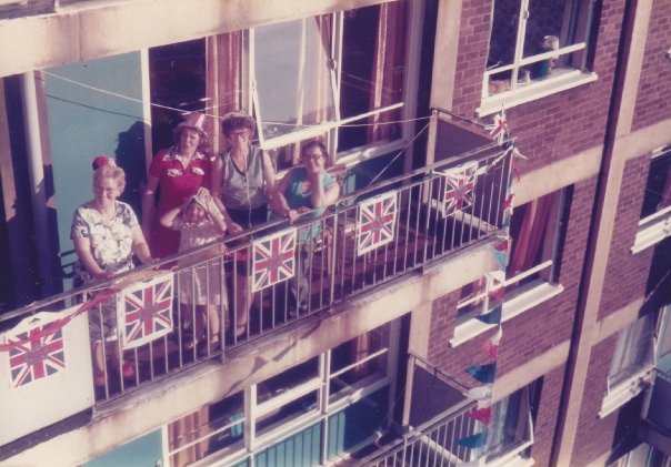 Grace Randle (far left) and others on the verandah of 98 Shakespeare House with bunting and flags to celebrate the Silver Jubilee of Queen Elizabeth the II on 7th June 1977