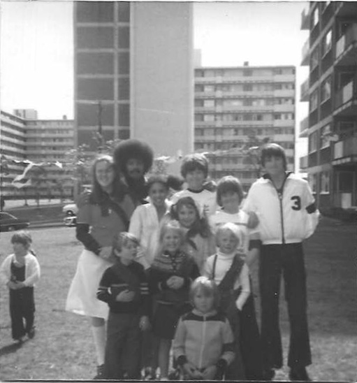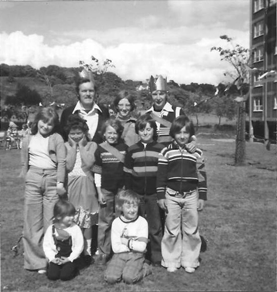 Again in between John Bacon Court and Shelley House (on the right). In the back row are Dave Cook, Julie Christine Cooney, and Robert Wood. Also in the picture are Maris Wade (far left in the middle row) and Steve Love (far right of the middle row). Do you recognise anyone else?