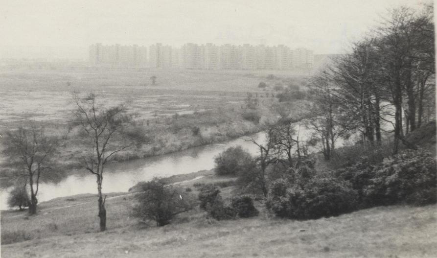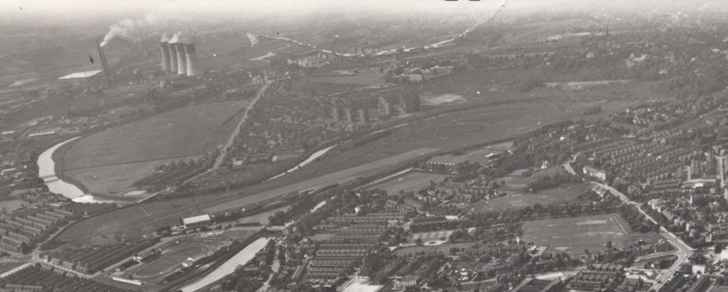A wide view of the flats across the Racecouse taken in 1964 from the Cliff. Roll your mouse over the picture for the same image in the 1980s.