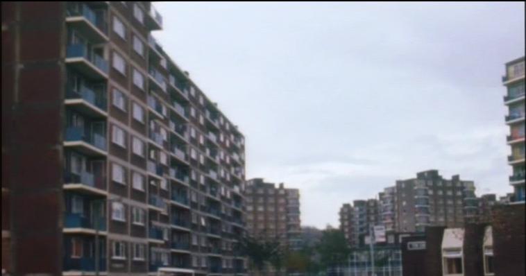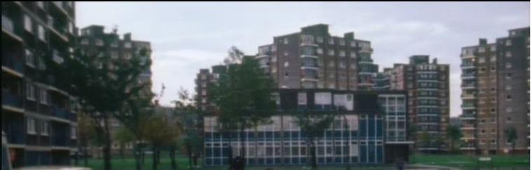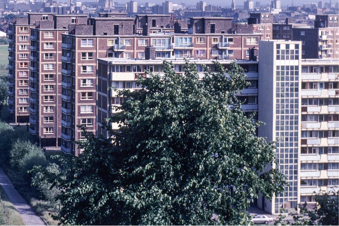 A view down Kersal Way from the South Radford Street end in 1980. On the left are Shakespeare and Spencer House, and Jonson and Milton on the right. Roll your mouse over the image for a view of this area today. |