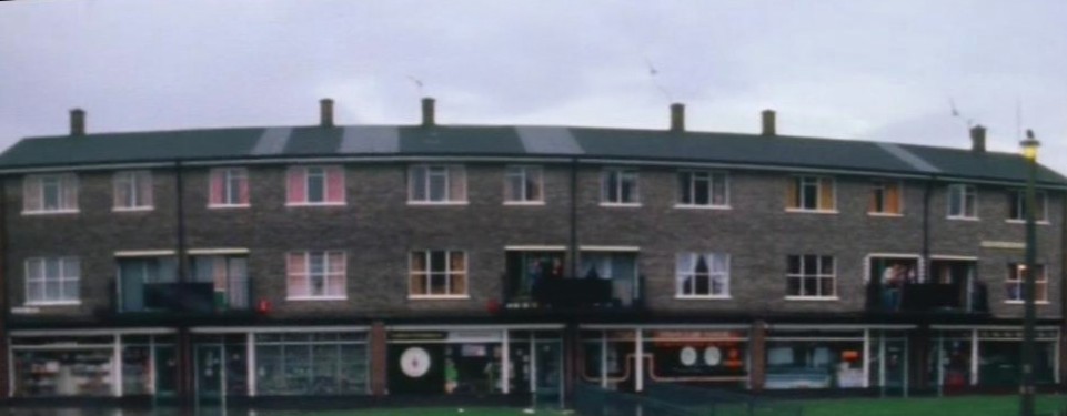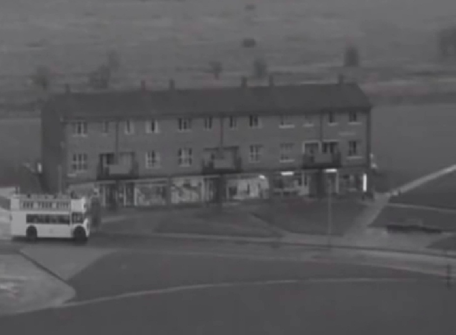 A panormic view of the shops in 1980 which shows both the original shops and the second set of shops which contained the launderette, the mace and the chippy.