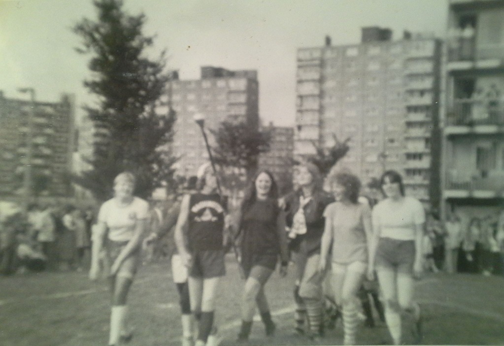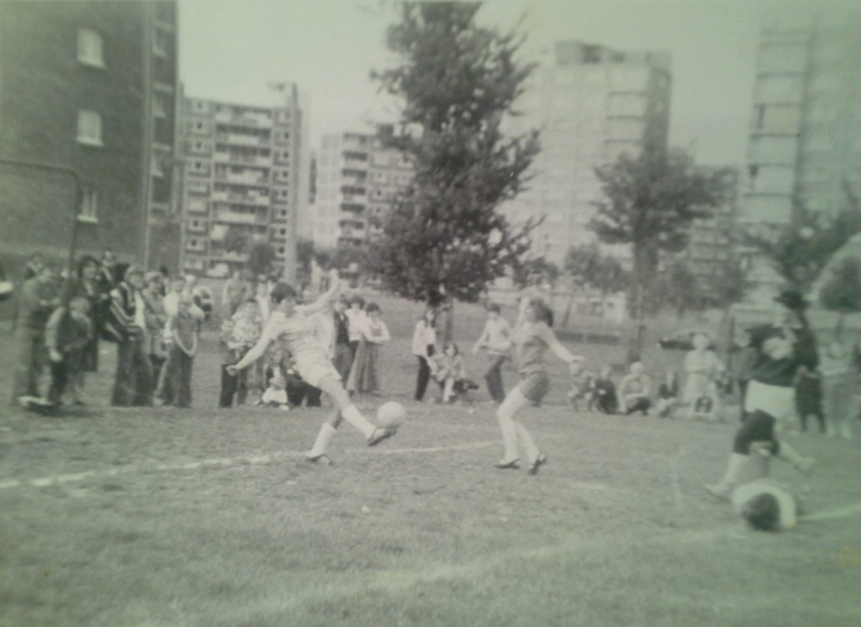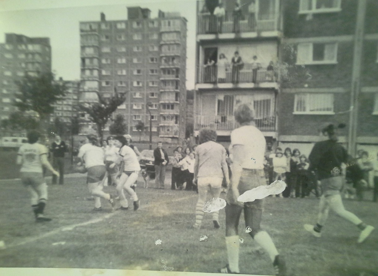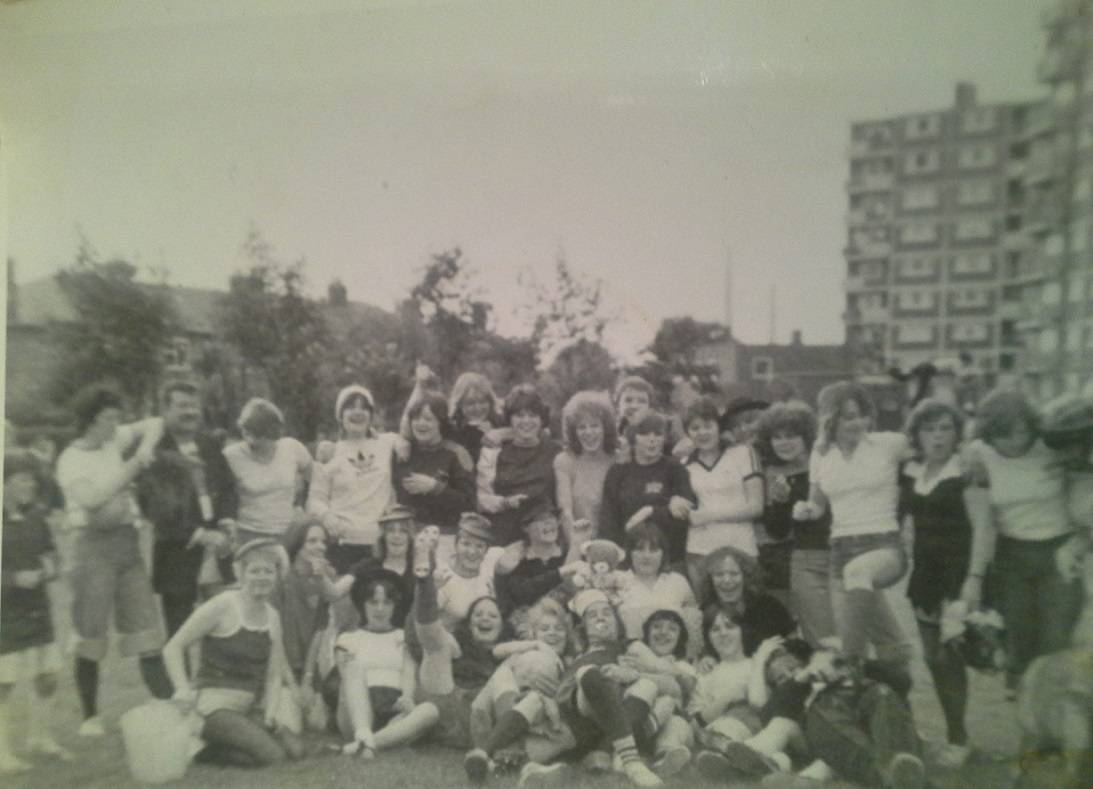 A series of pictures detailing a football match that took place between some ladies from Kersal Flats and some from Hanky Park. The match took place in 1980 on the old pitch behind Burns House.