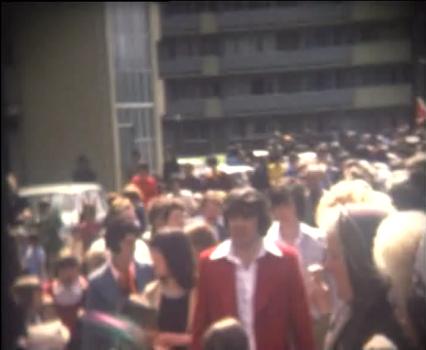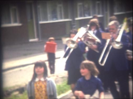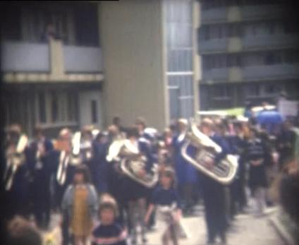 The brass band reaches the back of John Bacon Court. The lad in the red box dressed up as a box of Oxo is Martin Ormandy